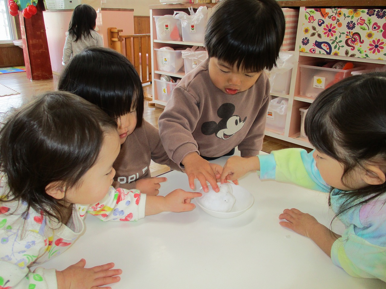 1歳すみれぐみ 狭いところ大好き!箱車に乗って「行ってきま~す!!」 あっ!大切なクマのお友達も一緒に行こうね! 「どこが痛いですか?」「注射しますね~」 小さなお医者さんが診察してくれます。 動物カルタとり。 「えっと…ウサギはどこかな!?」先生が言った動物を必死に探しています。 雪がたくさん降った日、園庭に少しだけ雪が積もりました。 お皿に雪を入れて“ちょんちょん”「冷た~い!!」